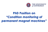 A fully funded PhD Position on the "Condition monitoring of permanent magnet machines", is open at the University of Edinburgh, UK. The PhD project, to be supervised by Dr. Konstantinos Gyftakis (Lecturer at the University of Edinburgh, UK and CISE Researcher), aims to develop a reliable diagnostic method to detect various PM machine faults.