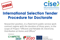 The call for application for the International Selection Tender Procedure for Doctorate at CISE - Electromechatronic Systems Research Centre, in the framework of Project Ef&RelDC@HomO: “Efficient and Reliable DC Electricity Distribution at Home and Offices" (POCI-01-0145-FEDER-029494) is now closed.